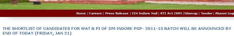 They have mentioned that – THE SHORTLIST OF CANDIDATES FOR WAT & PI OF IIM INDORE PGP- 2011-13 BATCH WILL BE ANNOUNCED BY END OF TODAY (FRIDAY, JAN 21)